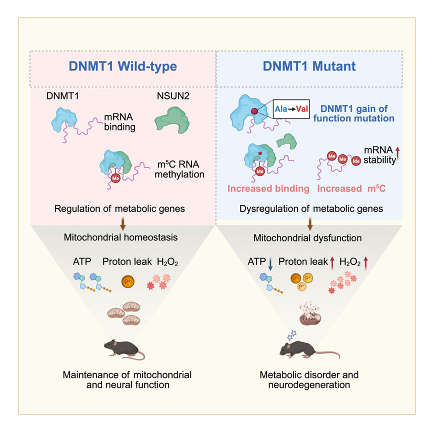 DNMT1是一种维持DNA甲基化的DNA甲基转移酶。其复制焦点靶向序列(RFTS)结构域中的点突变会导致晚发性神经退行性疾病,如常染色体显性小脑性共济失调-耳聋和嗜睡症(ADCA-DN)疾病。本研究首先验证了DNMT1具有结合mRNA转录本的功能,并通过招募NOP2/Sun RNA甲基转移酶2(NSUN2)来促进RNA m5C甲基化。同时,RNA m5C甲基化增强那些调节线粒体功能基因的RNA稳定性。当小鼠的DNMT1 RFTS结构域发生突变时,会引发异常的DNMT1-RNA相互作用,并显著提高部分代谢基因的m5C RNA甲基化和RNA稳定性。因此,代谢RNA转录本水平增加导致了累积性的氧化应激、线粒体功能障碍和神经症状。总体而言,本研究结果揭示了DNMT1在调节DNA和RNA甲基化中的双重作用,并进一步调节了线粒体功能,为DNMT1突变诱导的神经退行性疾病的发病机制提供了新见解。