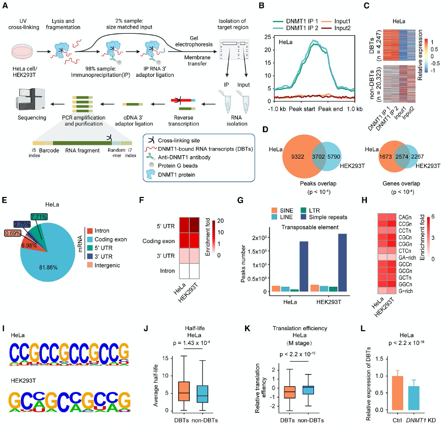 增强型交联免疫沉淀测序(eCLIP-seq):鉴定DNMT1结合的mRNA转录本(DNMT1-bound mRNA transcripts,DBTs),发现DNMT1能够结合大量mRNA,并影响其稳定性。