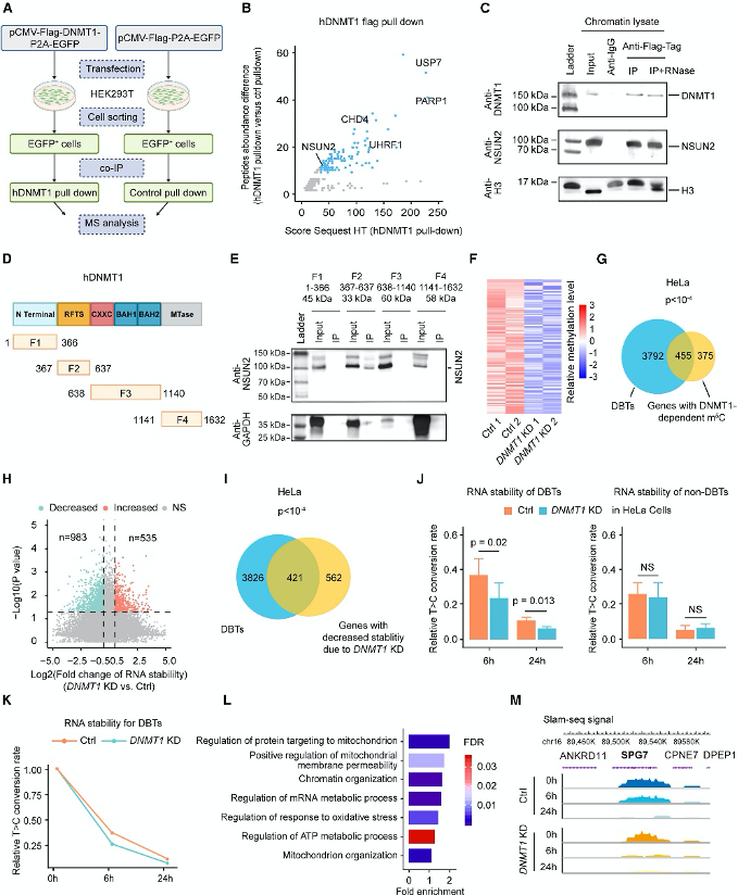 DNMT1能够通过招募NSUN2蛋白来调节RNA m5C甲基化。通过免疫共沉淀实验和质谱分析,研究者发现DNMT1与NSUN2之间存在直接相互作用,且这种相互作用部分依赖于RNA。RNA-BS-seq分析显示,DNMT1敲低(KD)的细胞中m5C水平显著降低,且这些位点与DBTs高度重叠。