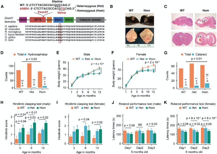 小鼠模型:构建Dnmt1A560V突变小鼠模型,用于研究DNMT1突变对神经系统的长期影响。