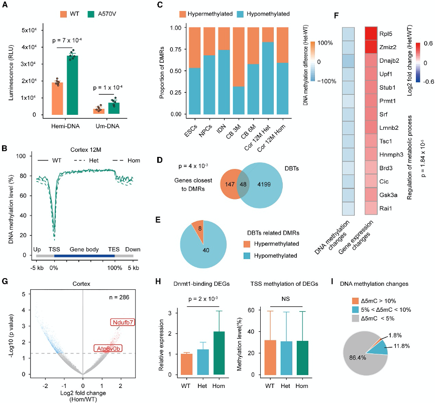 (I) 对皮层中与DBT相关的DEGs的TSS±2kb区域中,纯合子(Hom)与野生型(WT)之间的DNA甲基化变化比例分析。