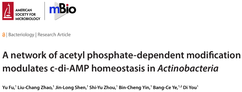 Fu Y, Zhao L-C, Shen J-L, Zhou S-Y, Yin B-C, Ye B-C, You D. A network of acetyl phosphate-dependent modification modulates c-di-AMP homeostasis in Actinobacteria. mBio. 2024 Jul 9:e0141124. doi: 10.1128/mbio.01411-24.