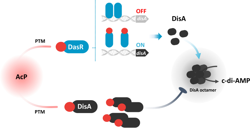具体而言,DisA的K66位点乙酰化直接失活其二腺苷酸环化酶活性,从而抑制c-di-AMP产生,而DasR的K78位点乙酰化则导致disA表达增加和c-di-AMP水平升高。因此,AcP是c-di-AMP维持中的一个关键分子开关,它响应环境变化,可能抑制有效发育。因此,AcP介导的翻译后修饰(PTM)构成了合成酶/水解酶调控c-di-AMP稳态的网络。