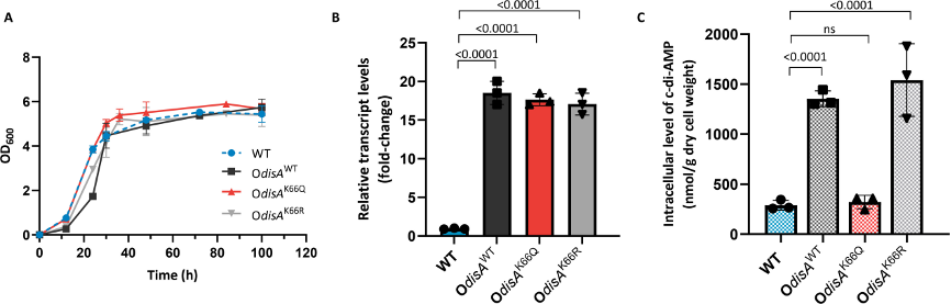 (B) 在TSB培养基中培养的WT、OdisAWT、OdisAK66Q和OdisAK66R菌株中disA基因的转录水平。