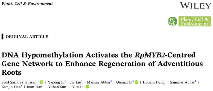 Hussain SS, Li Y, Liu J, Abbas M, Li Q, Deng H, Abbas S, Han K, Han J, Sun Y, Li Y. DNA Hypomethylation Activates the RpMYB2-Centred Gene Network to Enhance Regeneration of Adventitious Roots. Plant Cell Environ. 2024 Oct 28. doi: 10.1111/pce.15236.