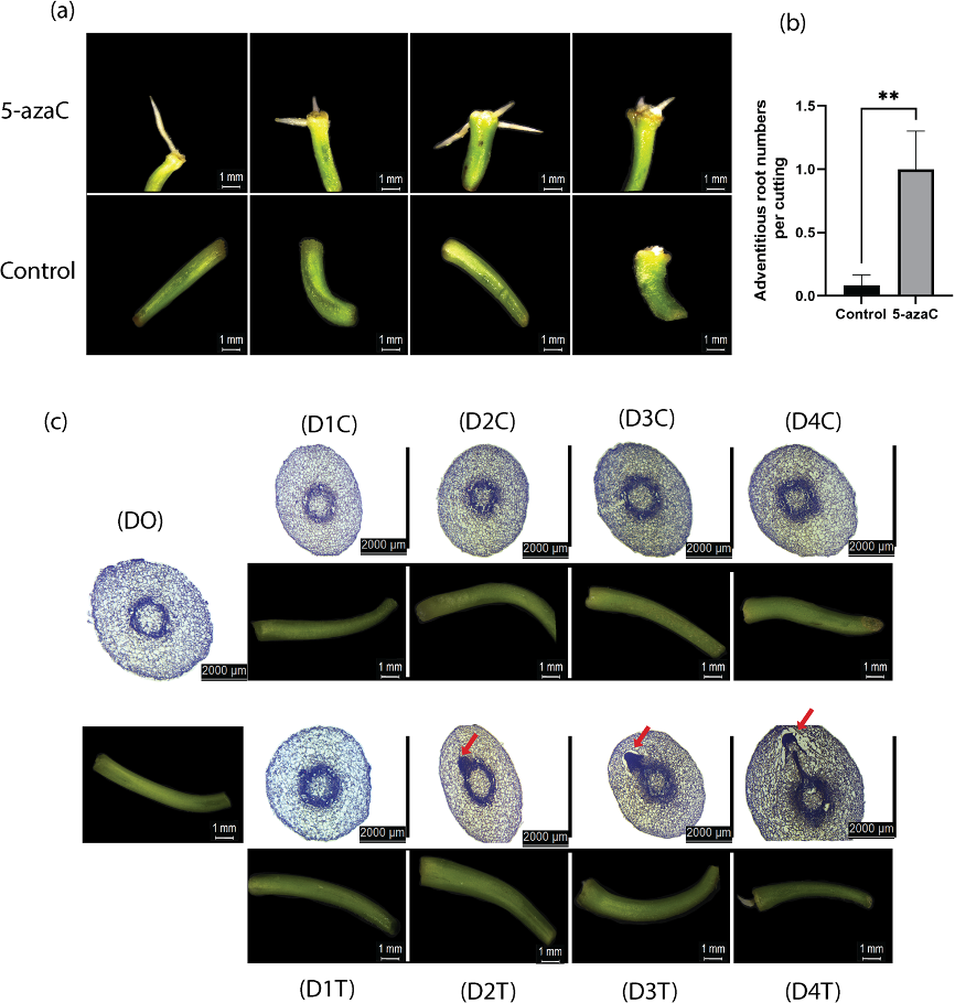 研究通过石蜡切片观察了5-azaC处理和未处理切段的不定根原基启动和发育过程。从8日龄幼苗的下胚轴切取1cm长的切段作为外植体,并在切割后的五个时间点(包括切割后的第0天、第1天、第2天、第3天和第4天,分别标记为D0、D1、D2、D3和D4)进行横截面分析。通过在不同时间点的组织学对比区分对照组(D1C、D2C、D3C、D4C)和5-azaC处理组(D1T、D2T、D3T、D4T)外植体中原基的发育进程以及根分生组织的增殖情况。结果显示,5-azaC处理显著加速了不定根原基的启动和发育,处理组在第4天即可观察到不定根的形成,而对照组则未能发育出完整的不定根(图1)。这表明5-azaC通过促进细胞分裂和分化,显著增强了不定根的再生能力。