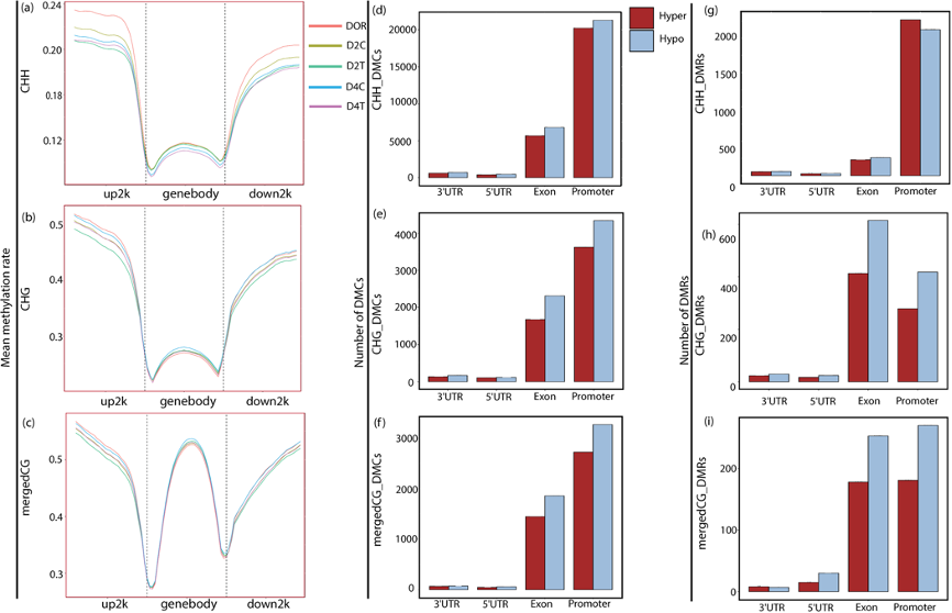 在5-azaC处理和对照样本中,第2天和第4天的基因及其±2kb区域CHH背景(a)、CHG背景(b)和mergedCG背景(c)中的DNA甲基化水平变化。在CHH背景(d)、CGH背景(e)和mergedCG背景(f)中,不同基因组元件(包括启动子、外显子、5′UTR和3′UTR)中高甲基化和低甲基化差异甲基化位点(DMCs)数量。在CHH背景(g)、CGH背景(h)和mergedCG背景(i)中,不同基因组元件(包括启动子、外显子、5′UTR和3′UTR)中高甲基化和低甲基化差异甲基化区域(DMRs)数量。
