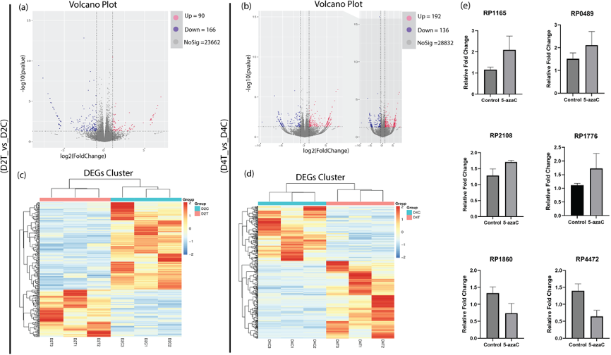 火山图展示了D2C与D2T组(a)以及D4C与D4T组(b)之间的差异表达基因(DEGs)。热图描绘了D2C与D2T组(c)以及D4C与D4T组(d)之间的差异表达基因。所选上调和下调差异表达基因的相对表达量(e)。