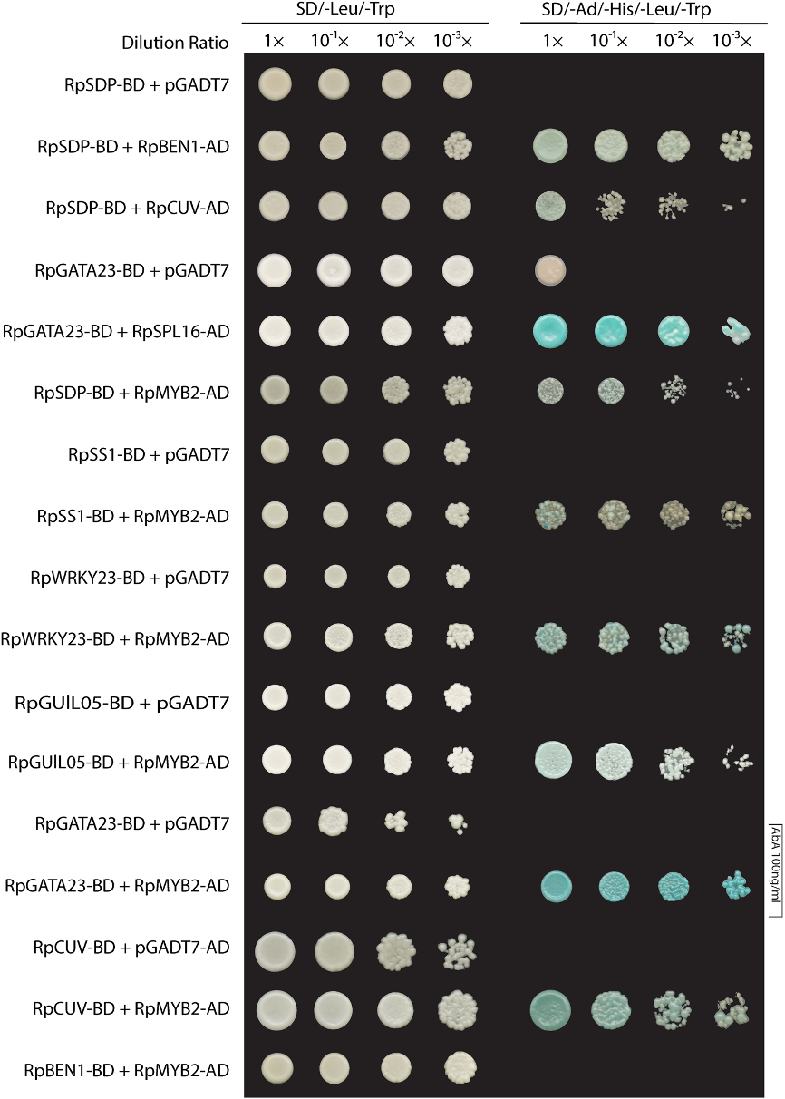 图4:通过酵母双杂交实验检测蛋白-蛋白互作。展示RpMYB2和RpSDP蛋白与其他蛋白的正向互作。