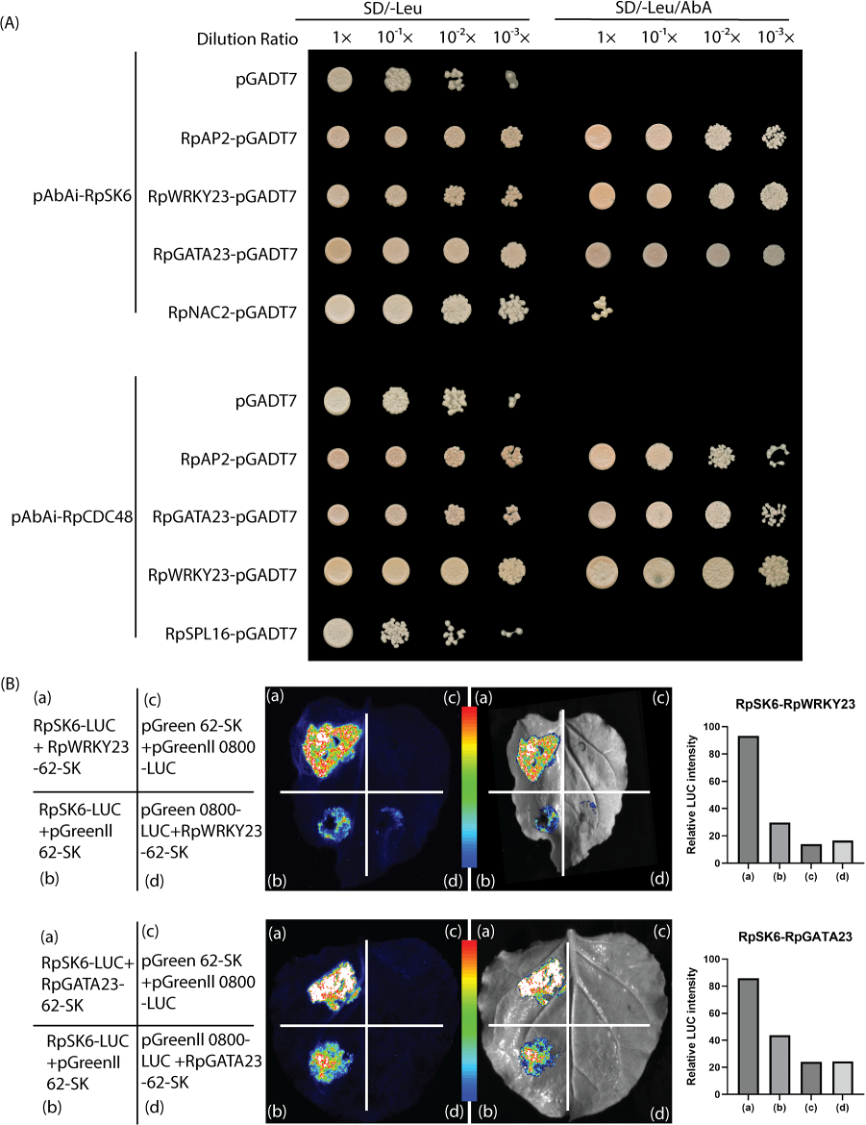 (B) 荧光素酶报告基因实验显示转录因子RpWRKY23和RpGATA23与RpSK6启动子的相互作用。