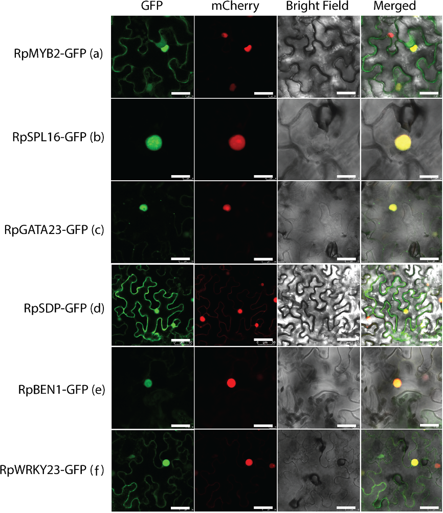 图6:RpMYB2互作蛋白的亚细胞定位。共聚焦激光扫描显微镜图像显示了用GFP标记的蛋白的细胞内分布。所有研究的蛋白主要定位于细胞核。RpMYB2、RpSDP和RpWRKY23还显示出在质膜定位。