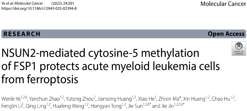 Ye, W., Zhao, Y., Zhou, Y. et al. NSUN2-mediated cytosine-5 methylation of FSP1 protects acute myeloid leukemia cells from ferroptosis. Mol Cancer 24, 201 (2025). Doi:10.1186/s12943-025-02394-8