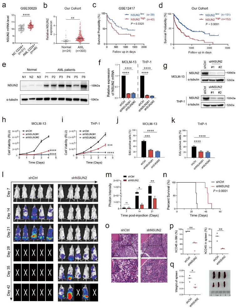 研究人员分析了NSUN2在AML患者样本中的表达水平,发现其在AML患者中显著高于健康供体(图1a、b),且与不良预后相关(图1c、d)。在体外实验中,NSUN2基因敲除的AML细胞增殖能力下降(图1h、i),克隆形成能力减弱。在体内实验中,NSUN2基因敲除的AML细胞在小鼠模型中形成的白血病负荷减少,生存期延长(图1l-n)。