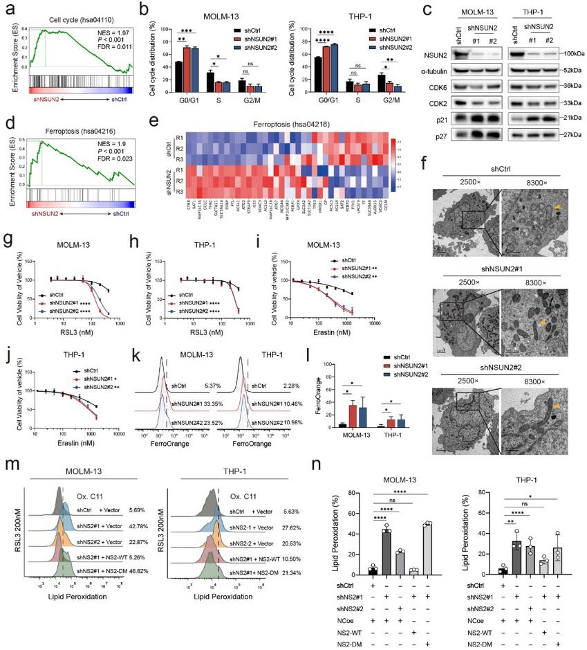 图2:NSUN2缺失介导AML细胞对铁死亡敏感。