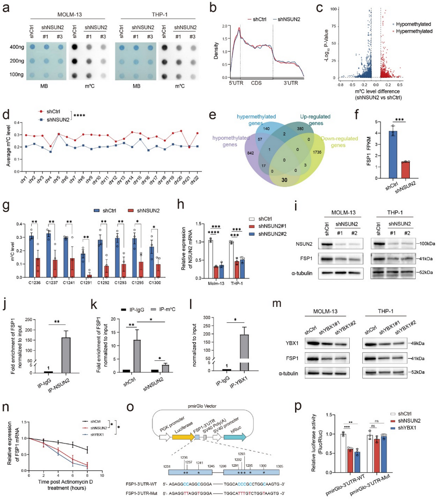 (h-i)NSUN2敲低降低了MOLM-13和THP-1细胞中FSP1 mRNA(h,qPCR)和蛋白(i,Western blot)水平。