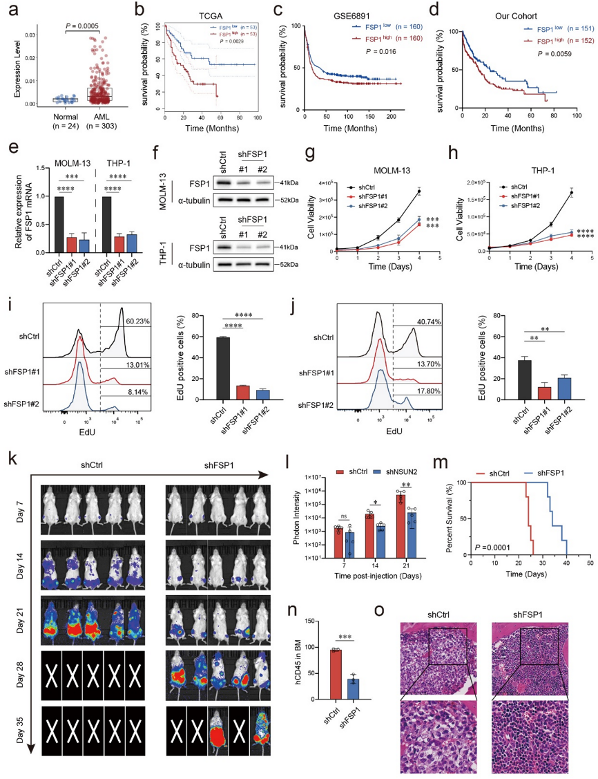 FSP1在AML患者骨髓样本中显著高表达(图4a),且其高表达与不良预后相关(图4b-d)。在体外实验中,FSP1基因敲除的AML细胞增殖能力下降(图4g、h),增殖细胞比例减少(图4i、j)。在体内实验中,FSP1基因敲除的AML细胞在小鼠模型中形成的白血病负荷减少,生存期延长(图4k-m),骨髓中人CD45阳性白血病细胞比例降低(图4n),组织学检查也显示骨髓中白血病细胞浸润减少(图4o)。