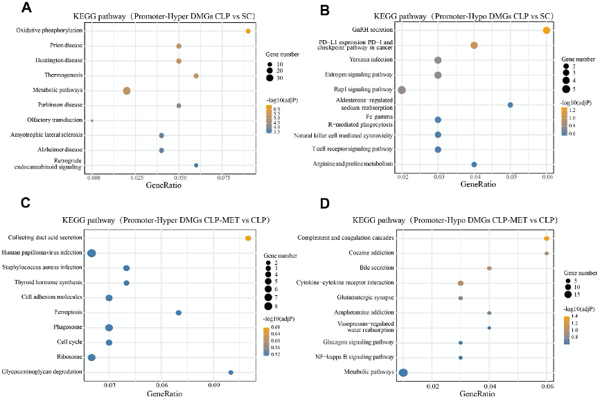 对启动子区域的D(h)MRs进行KEGG富集分析发现,CLP组的高甲基化DMRs主要富集于氧化磷酸化和代谢通路,而二甲双胍干预后,高甲基化DMRs转向富集于肾酸分泌和糖胺聚糖降解等通路。羟甲基化分析显示类似趋势,提示二甲双胍通过调节代谢相关基因的表观状态缓解肝损伤。