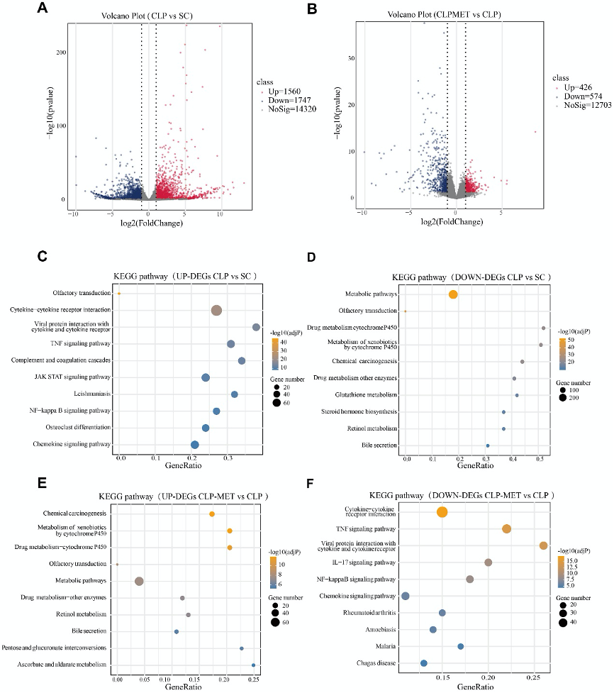 RNA-seq结果显示,CLP组共有3307个DEGs,其中上调基因富集于TNF、NF-κB等炎症通路,下调基因富集于代谢通路。二甲双胍干预后,629个DEGs被逆转,上调基因转向代谢通路,下调基因涉及炎症通路,表明二甲双胍通过抑制炎症、促进代谢修复发挥保护作用。