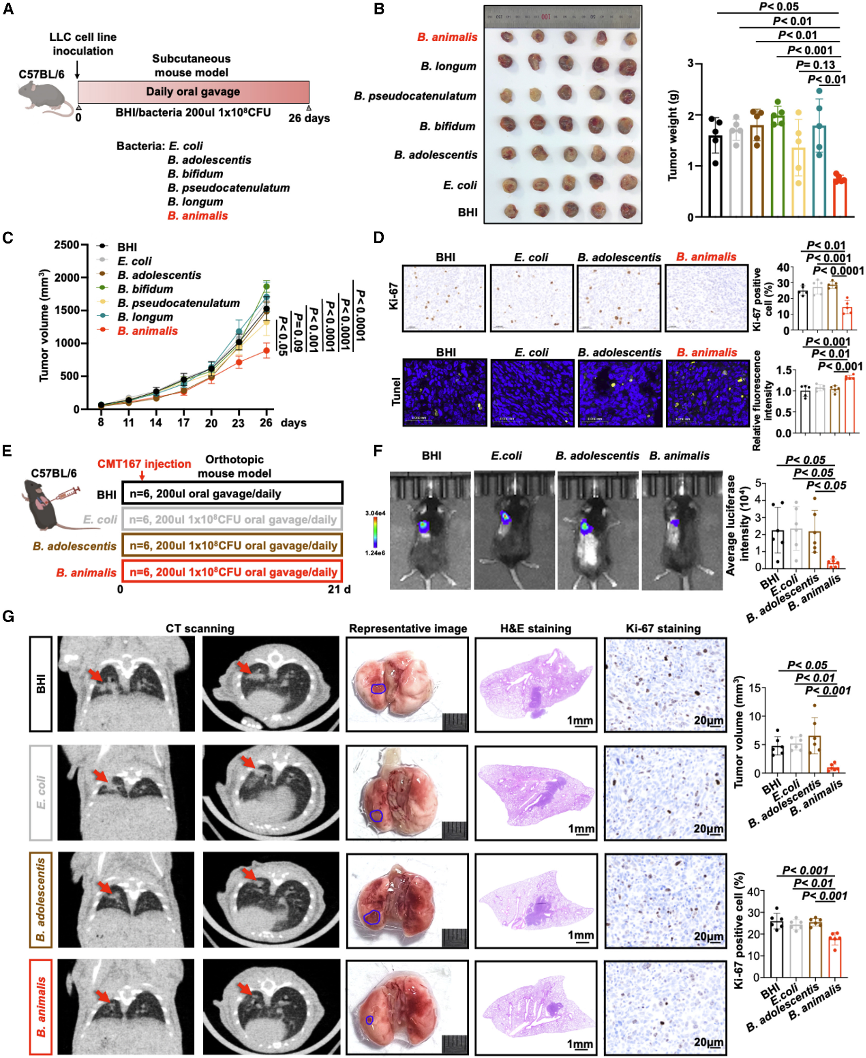 动物模型实验:皮下接种LLC细胞的异种移植模型和原位注射CMT167-Luc细胞的原位模型,通过灌胃给予B. animalis或其代谢产物IAA,评估肿瘤体积、重量和免疫细胞浸润。