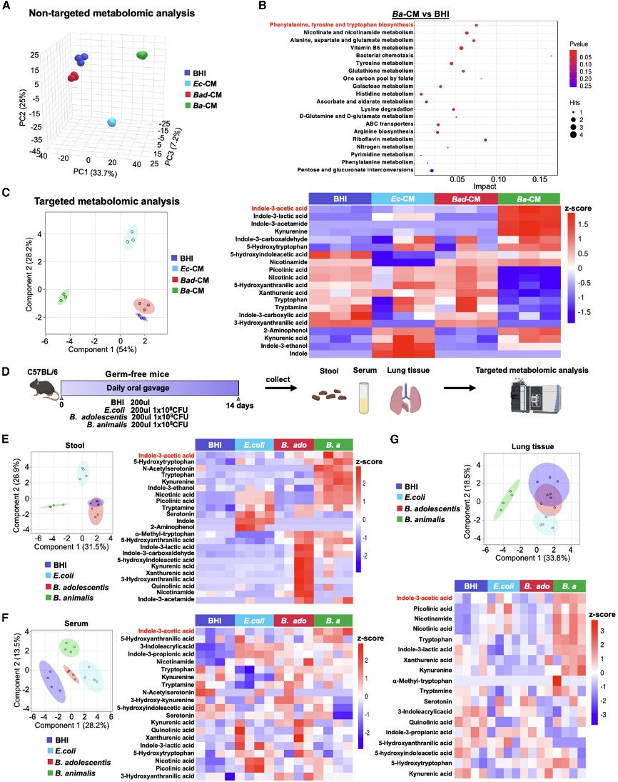 图3:细菌上清液和无菌小鼠的代谢组分析鉴定出IAA是B.animalis的主要代谢物