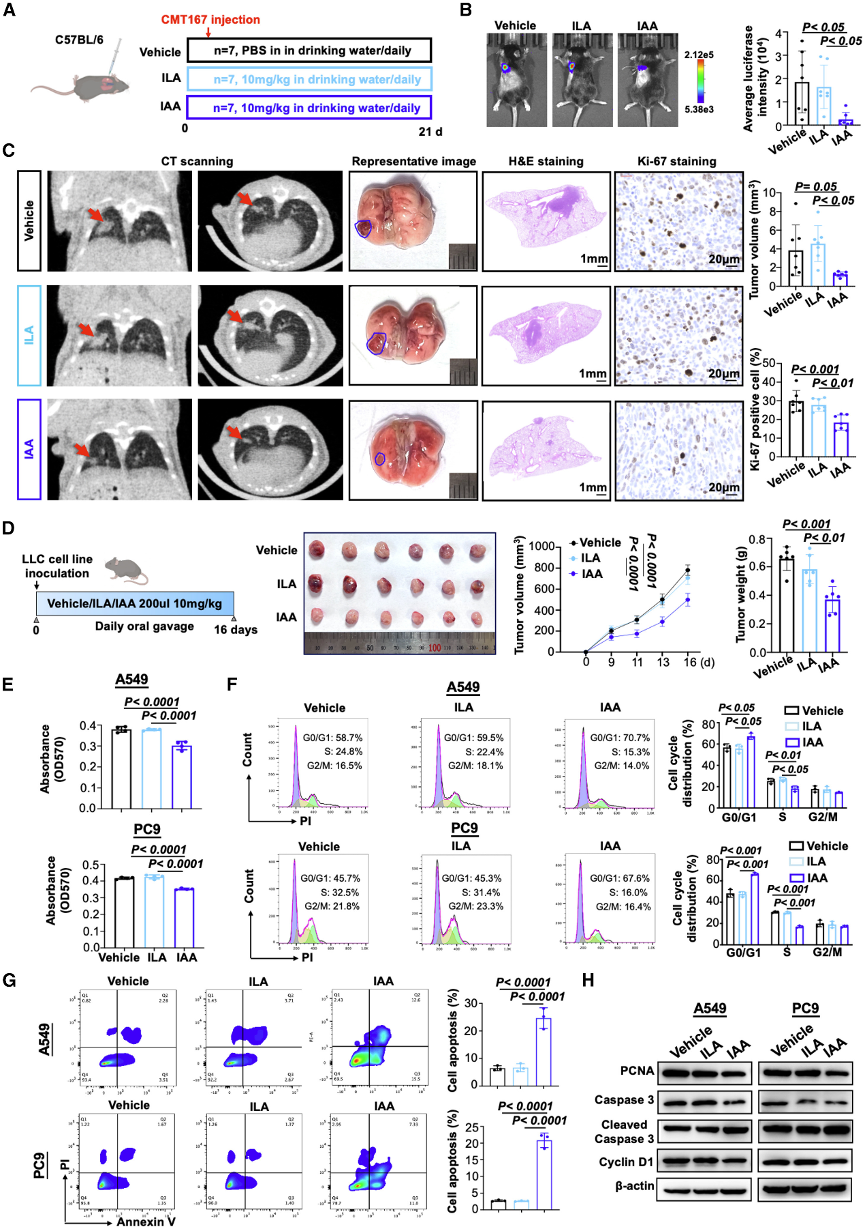 在CMT167原位和和皮下NSCLC小鼠模型中,IAA处理显著抑制肿瘤生长,表现为肿瘤荧光强度减弱和肿瘤体积缩小。体外实验也证实IAA能抑制NSCLC细胞的增殖,促进细胞周期阻滞和凋亡,并下调增殖相关蛋白(如PCNA和cyclin D1)的表达。这些结果验证了IAA能复制B. animalis的抗肿瘤作用,强调了代谢物在机制中的核心地位。