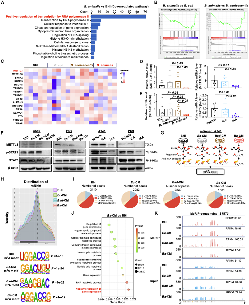 (K) 在BHI、Ec-CM、Bad-CM和Ba-CM中,STAT3的归一化m6A reads密度水平。Ba-CM处理后STAT3 mRNA的m6A peaks显著减少。
