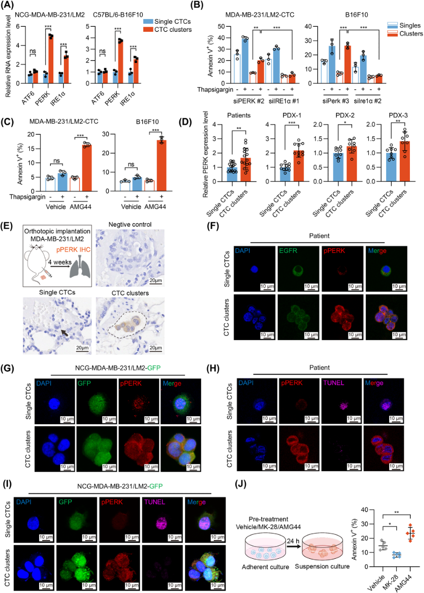 PERK在CTC clusters中表达和磷酸化水平均高于单CTC。敲低PERK显著增加CTC clusters的凋亡率。PERK抑制剂AMG44处理使CTC clusters对衣霉素敏感,而PERK激活剂MK-28可减少凋亡。体内实验显示,PERK-KO的CTC clusters在肺转移模型中凋亡增加,证实PERK是UPR通路中维持CTC clusters存活的重要因子。
