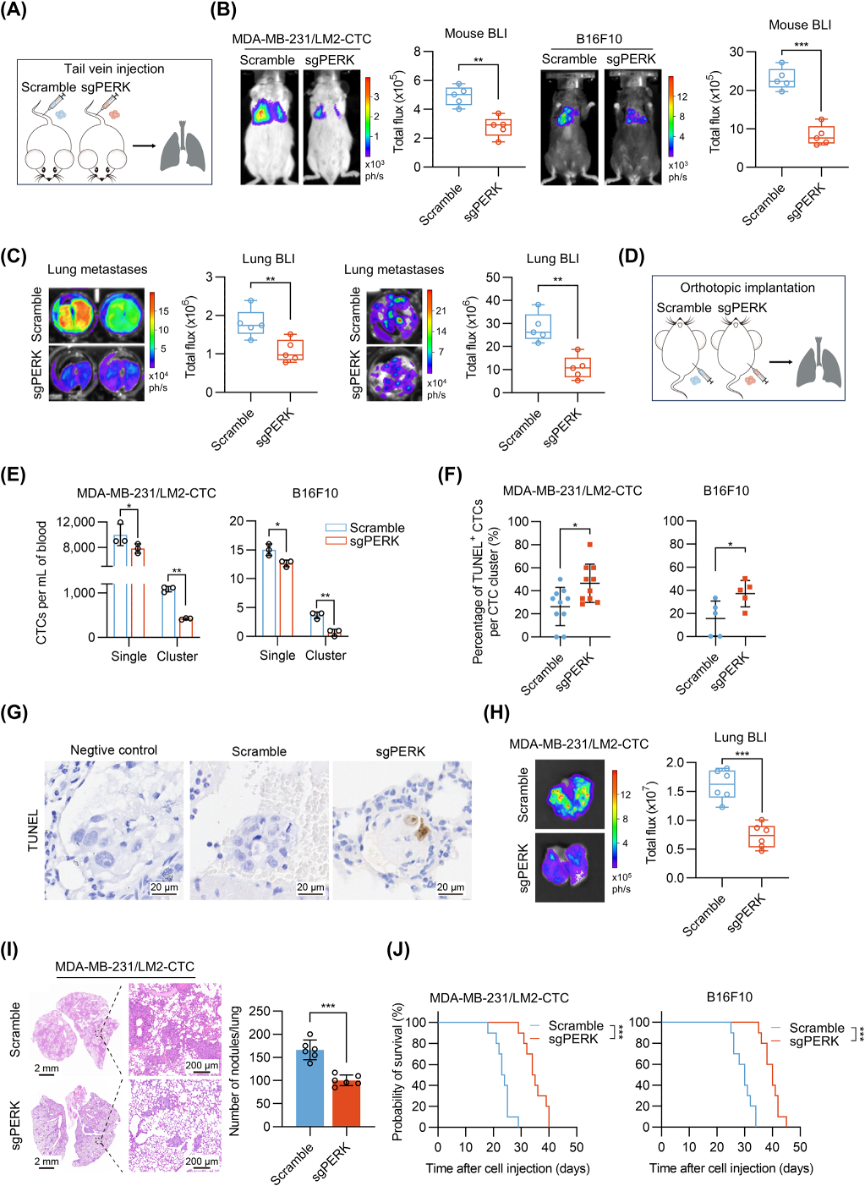 尾静脉注射PERK-KO的CTC clusters后,小鼠肺转移结节数量显著减少。原位移植PERK-KO肿瘤细胞的小鼠血液中CTC clusters数量下降,且簇内TUNEL阳性细胞增多。临床数据分析显示,PERK高表达与乳腺癌和黑色素瘤患者的不良预后相关,进一步支持PERK在转移中的促进作用。