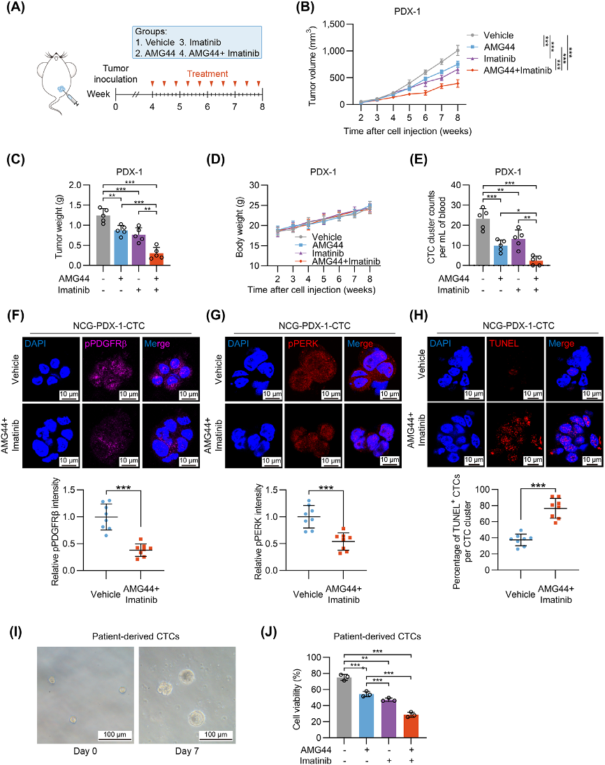 在PDX模型中,PERK抑制剂AMG44与PDGFRβ抑制剂伊马替尼联用,显著降低CTC clusters数量、原发肿瘤负荷和肺转移。患者来源的CTC体外实验证实联合用药可协同抑制细胞活力,表明双重靶向PERK和PDGFRβ具有临床转化潜力。