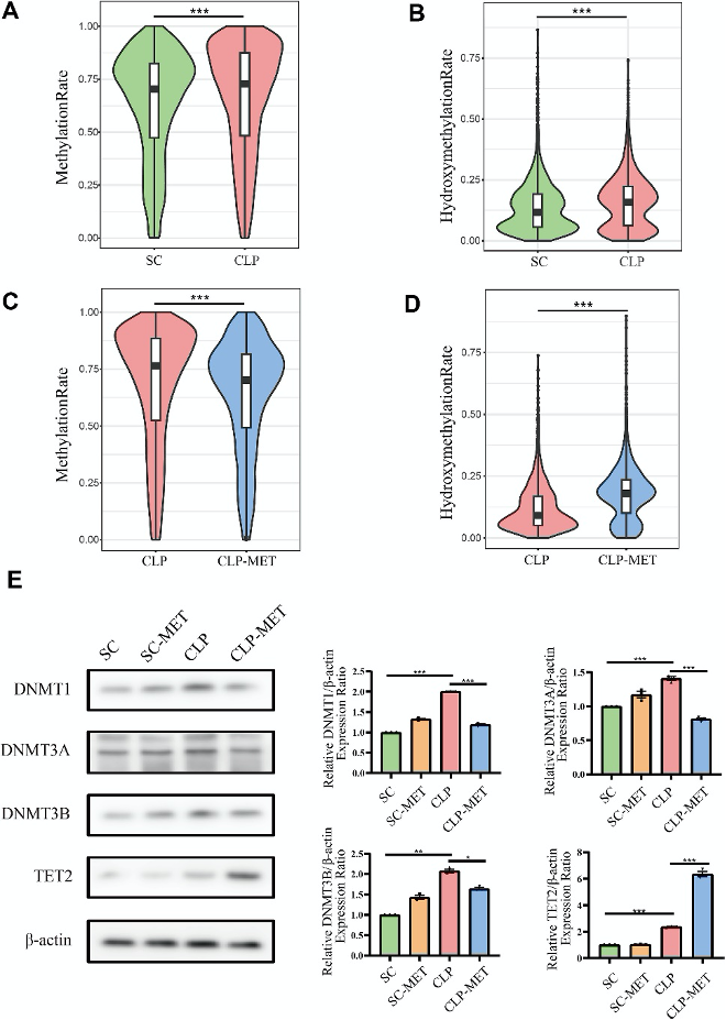通过RRBS和oxRRBS技术分析发现,CLP组大鼠肝组织表现出全局DNA高甲基化和高羟甲基化,而二甲双胍干预(CLP-MET组)显著降低甲基化水平并进一步升高羟甲基化。Western blot结果显示CLP组DNMT1、DNMT3A、DNMT3B和TET2表达上调,二甲双胍逆转了DNMTs表达并进一步促进TET2表达。这表明二甲双胍通过调控甲基化酶和去甲基化酶活性,重建了SLI中的表观遗传谱。