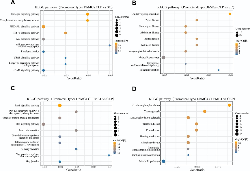 对启动子区域的D(h)MRs进行KEGG富集分析发现,CLP组的高甲基化DMRs主要富集于氧化磷酸化和代谢通路,而二甲双胍干预后,高甲基化DMRs转向富集于肾酸分泌和糖胺聚糖降解等通路。羟甲基化分析显示类似趋势,提示二甲双胍通过调节代谢相关基因的表观状态缓解肝损伤。