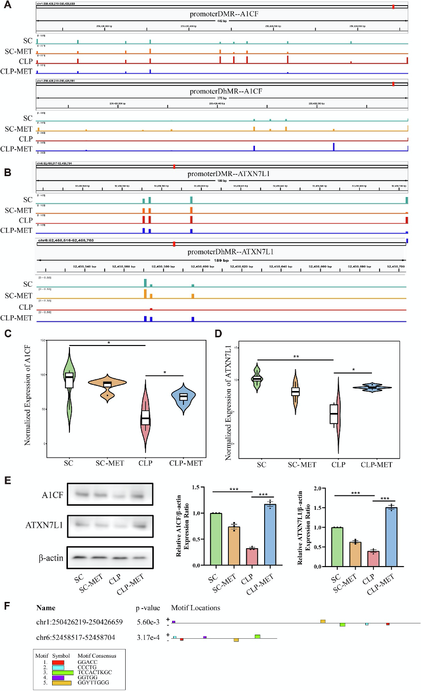 通过交叉分析甲基化、羟甲基化和转录组数据,筛选出两个关键基因A1CF和ATXN7L1。CLP组中这两个基因启动子甲基化升高、表达下调,而二甲双胍逆转了这一趋势。Western blot验证其蛋白水平变化一致,提示A1CF和ATXN7L1两个关键基因可能是二甲双胍表观遗传调控的核心靶点。