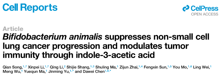 Song Q, Li X, Li Q, Shang S, Ma S, Zhai Z, Sun F, Mo Y, Wei L, Wu M, Ma Y, Yu J, Chen D. Bifidobacterium animalis suppresses non-small cell lung cancer progression and modulates tumor immunity through indole-3-acetic acid. Cell Rep. 2025 Aug 12;44(8):116132.doi: 10.1016/j.celrep.2025.116132.