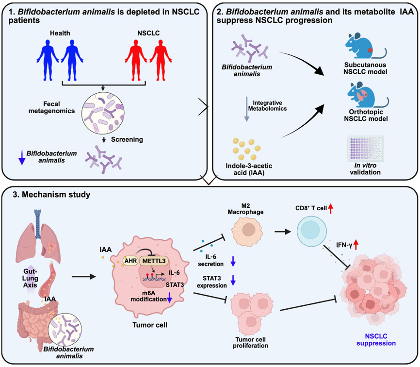 近年相关研究表明,肠道菌群及其代谢产物在NSCLC发生发展中具有重要作用。本研究发现,NSCLC患者与健康对照者的肠道菌群组成存在显著差异,尤其动物双歧杆菌(B. animalis)在NSCLC患者中显著减少。B. animalis在两种NSCLC小鼠模型和NSCLC细胞系中均能抑制肿瘤进展,研究整合代谢组学进一步揭示,吲哚-3-乙酸(IAA) 是B. animalis的关键代谢物,存在显著抗NSCLC活性。具体而言,B. animalis及其IAA通过激活肺部芳香烃受体(AHR),抑制METTL3介导的STAT3 m6A甲基化;同时通过抑制IL-6减少M2型巨噬细胞极化并增强CD8+ T细胞功能,从而通过肠-肺轴调节抗肿瘤免疫。B. animalis与IAA的补充为NSCLC预防提供了潜在策略。