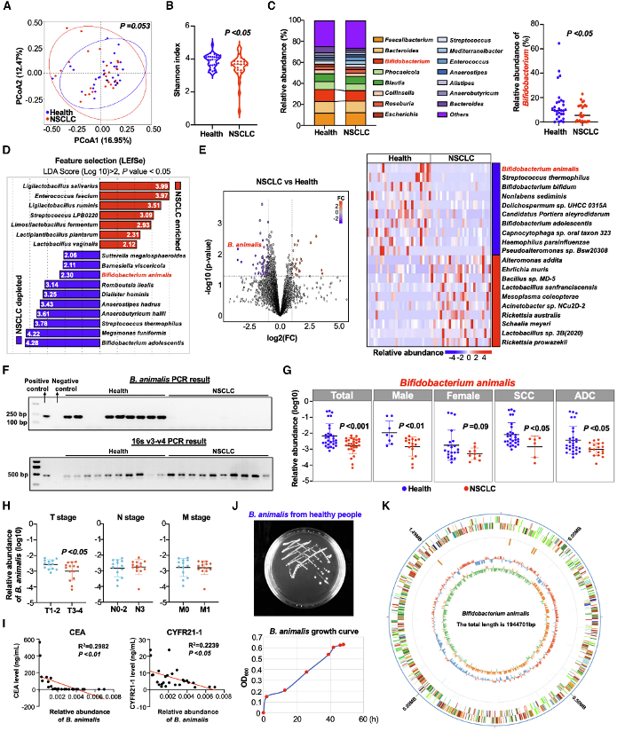 本研究通过宏基因组学分析发现,NSCLC患者肠道菌群多样性降低,且B. animalis在患者组中显著缺失。主坐标分析(PCoA)显示患者与健康对照的微生物组成存在差异,而线性判别分析(LEfSe)进一步确认B. animalis是NSCLC相关的缺失菌种。通过PCR验证,B. animalis在患者粪便中的丰度与肿瘤标志物(如CEA和CYFR21-1)呈负相关,提示其可能作为NSCLC的生物标志物。这一结果奠定了研究的基础,表明肠道菌群失调与NSCLC发生相关。