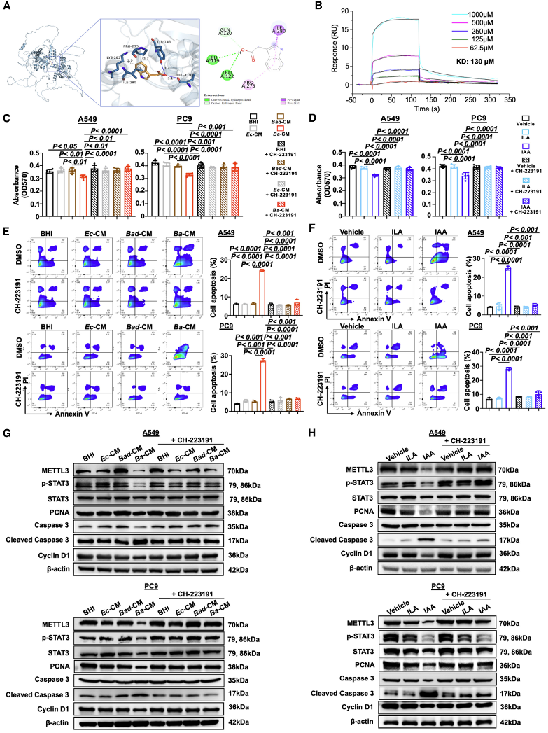 分子对接和SPR实验证实IAA能与AHR受体结合。HR抑制剂CH-223191部分抵消了B. animalis和IAA的抗肿瘤效果。Western blot分析显示,AHR抑制后,METTL3、STAT3和p-STAT3表达恢复,证实了AHR/METTL3/STAT3轴通路。这一结果将微生物信号与宿主表观遗传调控联系起来,突出了IAA-AHR互作的中心角色。