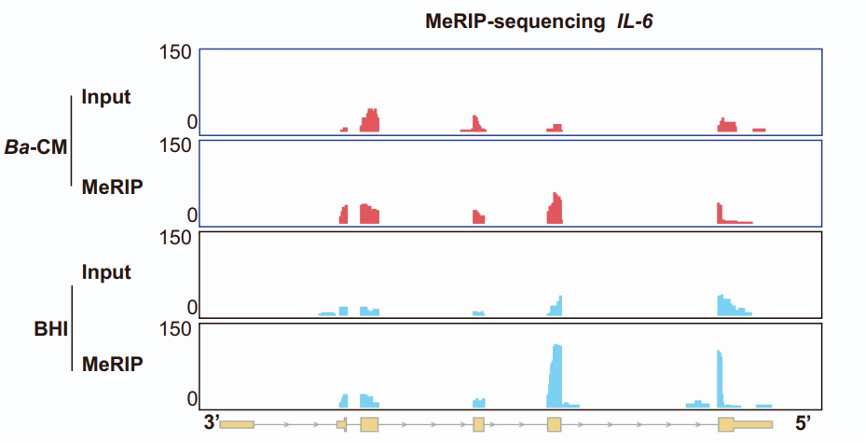 图8:m6A MeRIP-seq测序分析显示,Ba-CM显著减少IL-6 mRNA的m6A peaks。