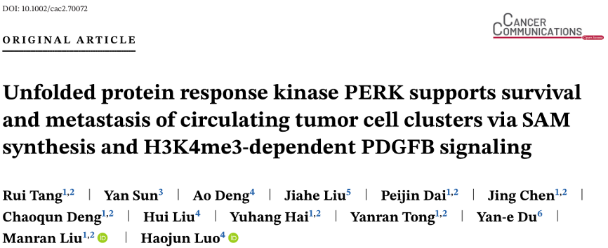 Tang R, Sun Y, Deng A, Liu J, Dai P, Chen J, Deng C, Liu H, Hai Y, Tong Y, Du YE, Liu M, Luo H. Unfolded protein response kinase PERK supports survival and metastasis of circulating tumor cell clusters via SAM synthesis and H3K4me3-dependent PDGFB signaling. Cancer Commun (Lond). 2025 Nov 10. doi: 10.1002/cac2.70072.