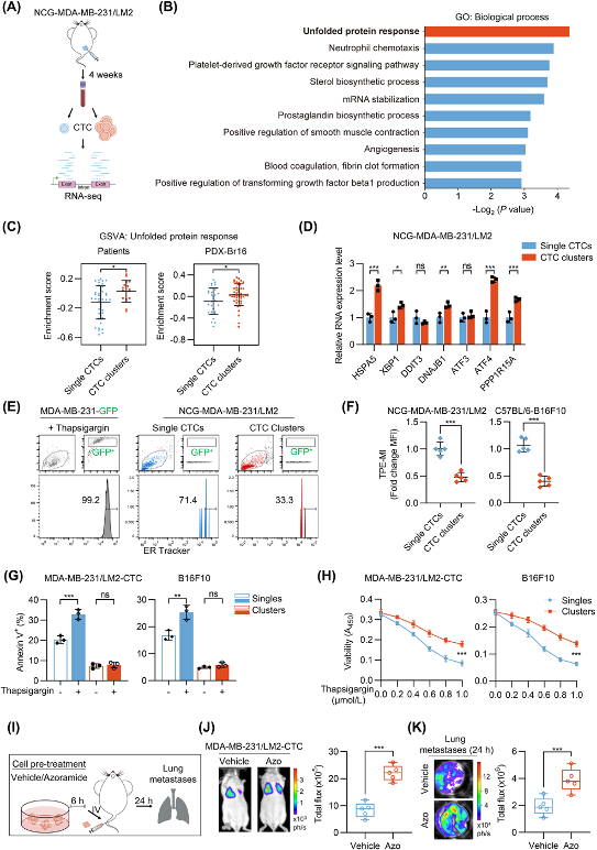 RNA-seq分析显示,CTC clusters中相关基因显著富集,UPR通路基因(如HSPA5、XBP1)显著上调。CTC clusters表现出更强的适应性UPR反应,能够有效抵抗内质网应激(ERS)诱导的细胞死亡。在模拟血液环境的悬浮培养中,CTC clusters的内质网应激标记物(如TPE-MI)积累低于单CTC,且对ERS诱导剂衣霉素的凋亡抵抗更强。预先用UPR激活剂Azoramide处理CTC clusters可增强其肺转移能力,表明UPR激活是CTC clusters适应血液环境的关键策略。