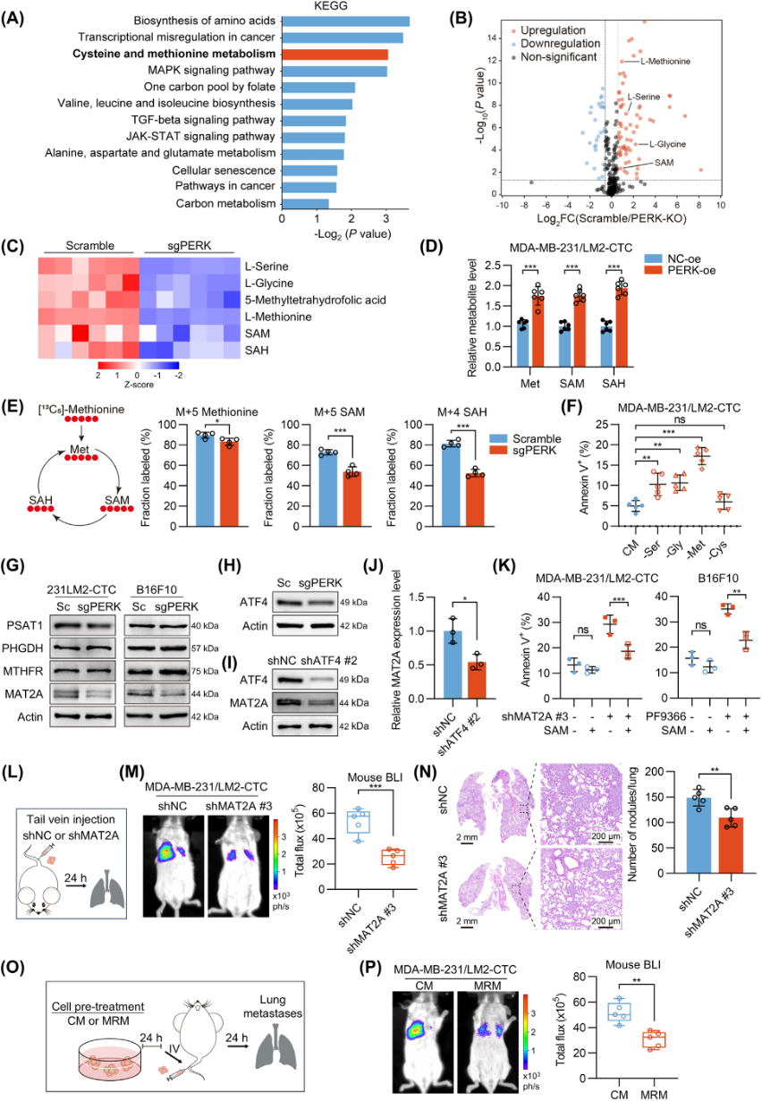 RNA-seq:比较PERK-KO与对照CTC clusters的转录组差异,并结合代谢组学分析揭示PERK在蛋氨酸代谢中的作用。。