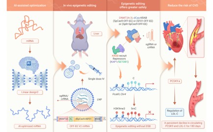 可编程表观遗传编辑器(EEs)能够在不改变DNA序列的情况下实现基因表达的长期调控,具有远大的治疗前景,然而当前基于CRISPR的表观基因组编辑器在临床转化方向面临重大挑战。本研究利用化脓性链球菌Cas9(SpCas9)、内含肽分割的SpCas9或更小的Cas-SF01(Cas12i3变体),对通过mRNA递送的表观遗传编辑器(CRISPR OFF-EE)进行合理设计与工程化构建,结合mRNA结构优化和脂质纳米颗粒(LNP)递送,单次静脉注射优化的OFF-EE V2 mRNA以及靶向小鼠Pcsk9的向导RNA(gRNAs),导致循环PCSK9水平降低约83.2%,相应的低密度脂蛋白胆固醇(LDL-C)水平降低约51.4%,效果持续至少180天。与基于SpCas9对应编辑器相比,基于SF01的编辑器显示出更高特异性,脱靶效应更少。此外,优化的LNP制剂还表现出良好安全性和肝脏靶向活性。这些发现建立了一个强大且多功能的平台,为基于瞬时递送、工程化mRNA编辑器的精确且长效的表观遗传沉默的体内治疗策略提供了有力证据。
