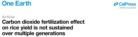 参考文献:Cai et al., Carbon dioxide fertilization effect on rice yield is not sustained over multiple generations, One Earth (2025), doi:10.1016/j.oneear.2025.101573